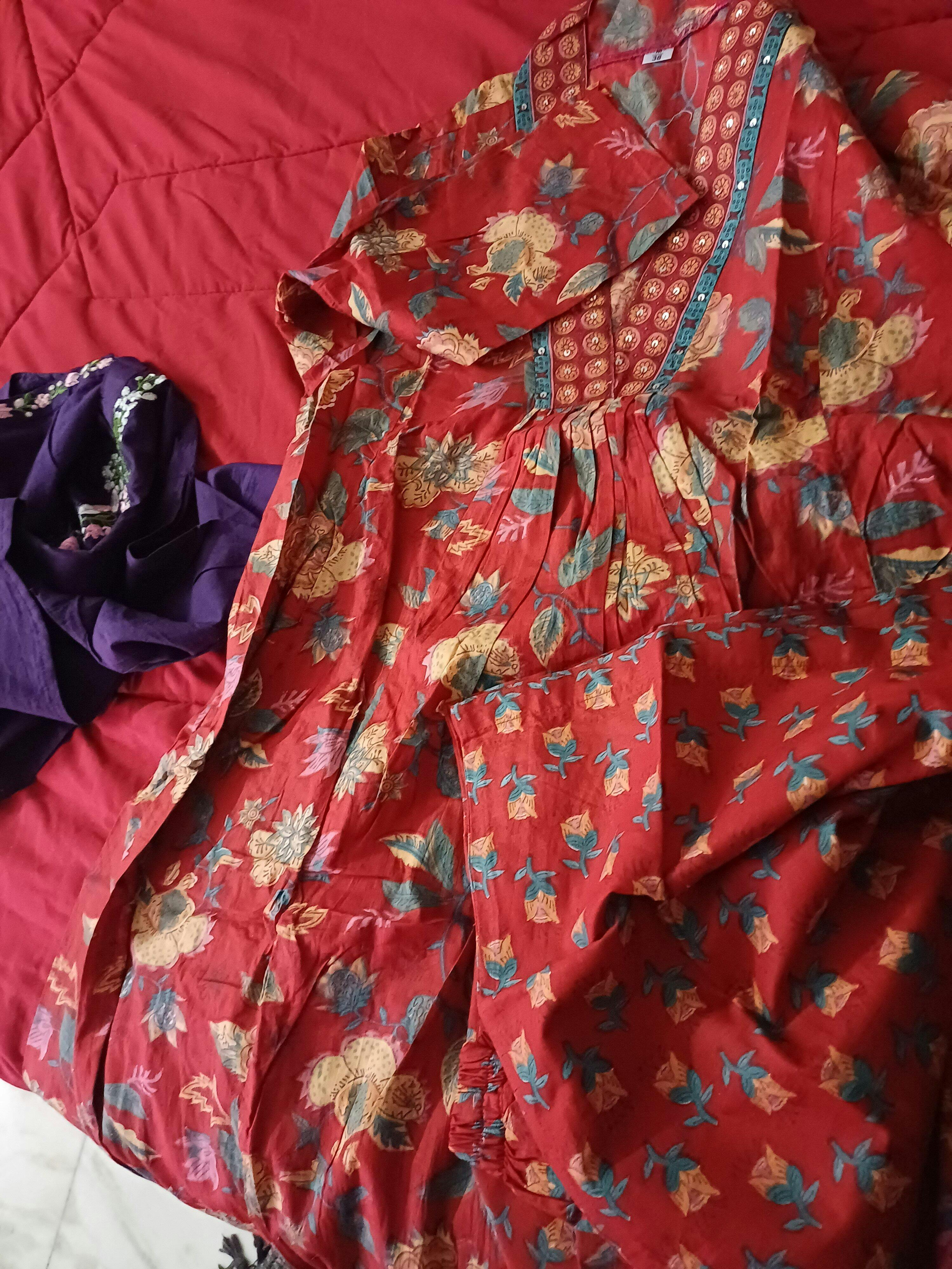 Experience comfort and style with our versatile Floral Printed Anarkali Kurta Set. This cotton three-piece set boasts a flowy calf-length Anarkali kurta, intricately printed with charming yellow and green florals on a soft cream fabric. Designed for all-day wear, it comes with a pair of comfortable straight pants and a complementary printed dupatta. Whether it's a family gathering, a festive event, or a relaxed day out, this ethnic set ensures you look and feel your best.