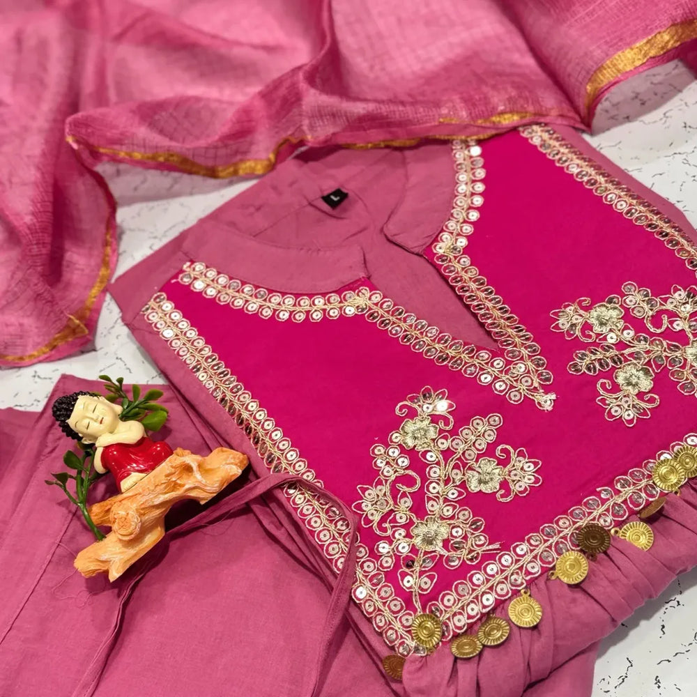Step into elegance with this Mulberry Pink Embroidered Cotton Kurta Pant with Dupatta Set, featuring exquisite hand embroidery on the yoke and a flowy silhouette that flatters every body type. Crafted from premium cotton, this 3-piece set includes a matching pant with a stylish pocket and a soft dupatta to complete the look. Perfect for festive gatherings and ethnic occasions, it blends traditional charm with modern comfort.