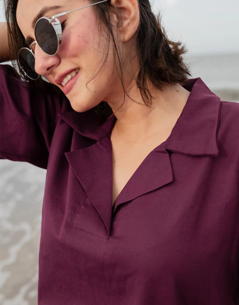 Crafted with care from soft, hand-loomed cotton, this fashion-forward ensemble is perfect for making a statement. The top features a stylish polo neckline and playful half sleeves, while the high-waisted shorts offer a flattering clinched fit and practical side pockets. With its straight silhouette and rich mulberry wine hue, this set is your go-to for effortless chic—whether you're out and about or just embracing your inner fashionista.